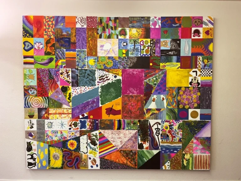 Unser Jubiläumsjahr geht zu Ende und uns bleibt dieses grossartige Gesamtkunstwerk: Unser Gemeinschafts-Jubiläumsbild, gemalt von Klient*innen, Mitarbeitenden und weiteren Festgästen.